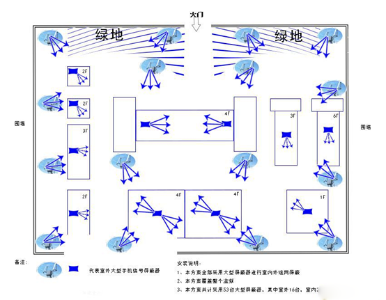 由上圖可以看出,采用新型智慧型屏蔽器,僅需4臺即可完成整個區域的無縫屏蔽,基于智慧型屏蔽的工作原理,不受周邊運營商基站信號的影響可以做到無縫無死角嚴格屏蔽。