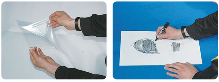 高度透明的PET塑料片。將兩張透明塑料片分別放置在現場足跡和樣本足跡上,用記號筆分別標畫足跡的特征點,再對兩張塑料片進行重疊檢驗。